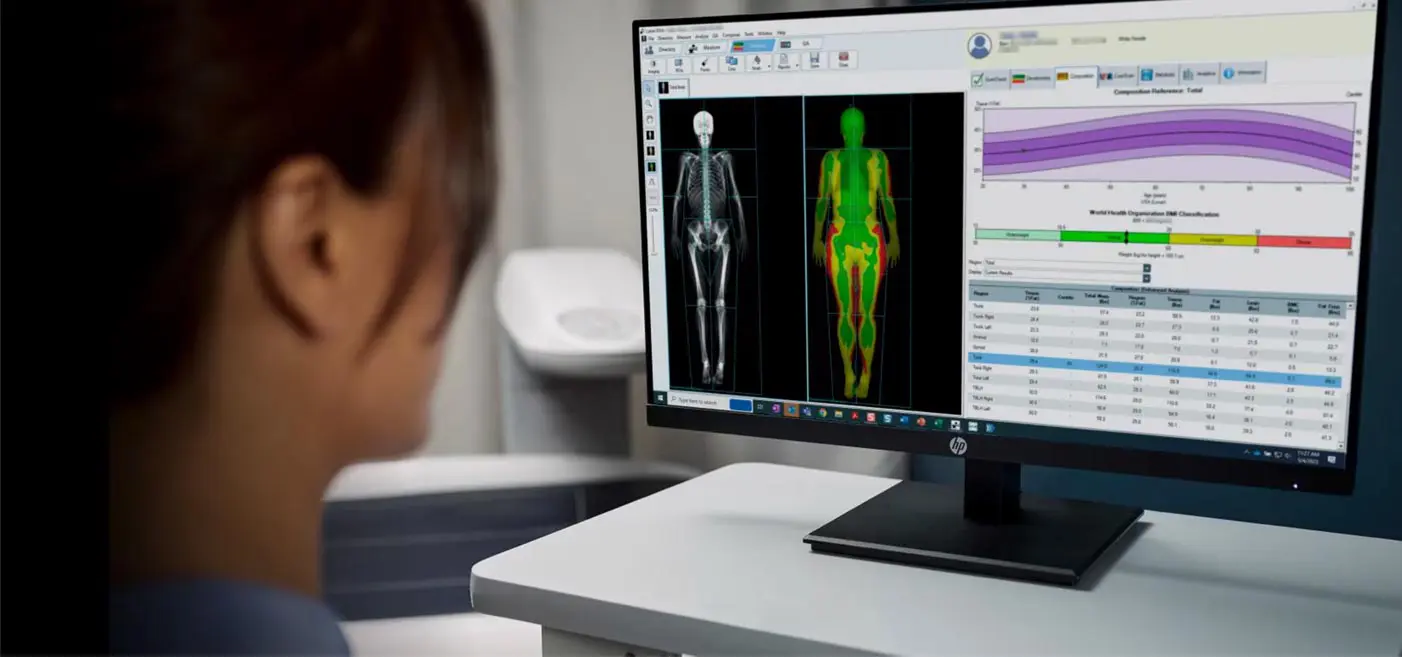 골밀도 검사는 이중에너지 X선 흡수계측법 DXA으로 이루어지며, 특히 노인에게서 자주 발생하고 매우 예후가 좋지 않은 대퇴부 측정을 포함하여 몸 전체의 뼈건강 상태를 파악할 수 있습니다.