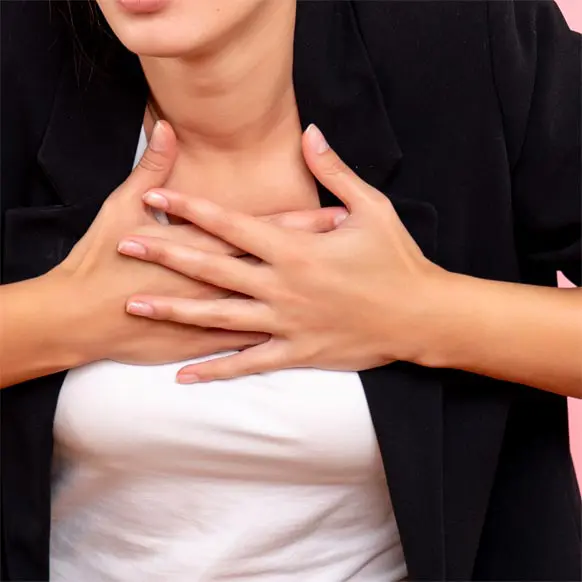 위산이 식도로 역류함에 따라 가슴통증, 속쓰림, 구역감, 목의 쉼 또는 이물감, 속쓰림, 연하곤란 또는 만성 기침 등의 증상을 일으킬 수 있습니다.